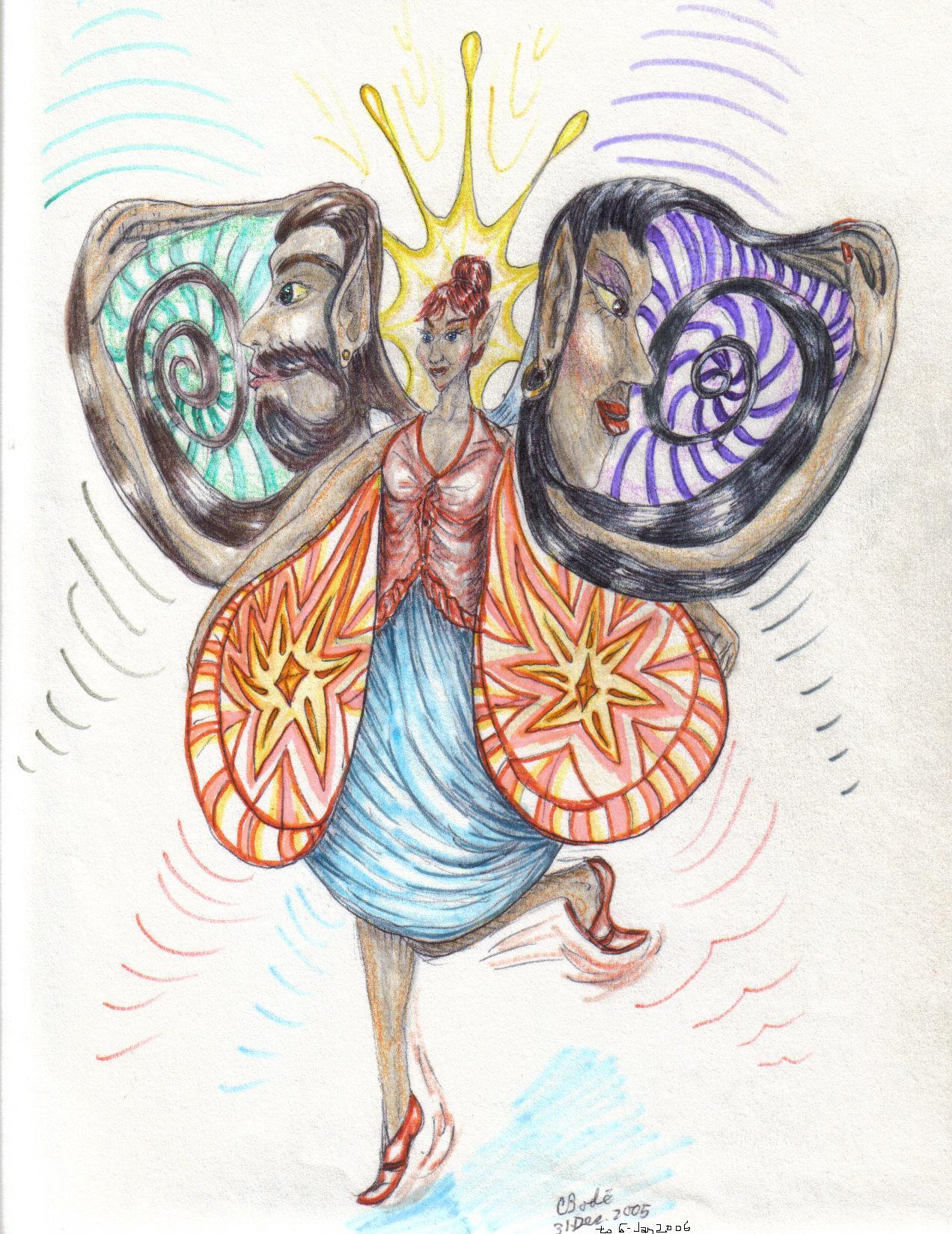 I came to the rainbow streaked tunnel once again. Inside the tunnel I saw this smelf-fae lumping up and down. It was like as if she was on a trampoline. Then I noticed that the wings not only had eyes, but the wings formed two faces. One wing had a male elven face, and the other wing had a female elven face.