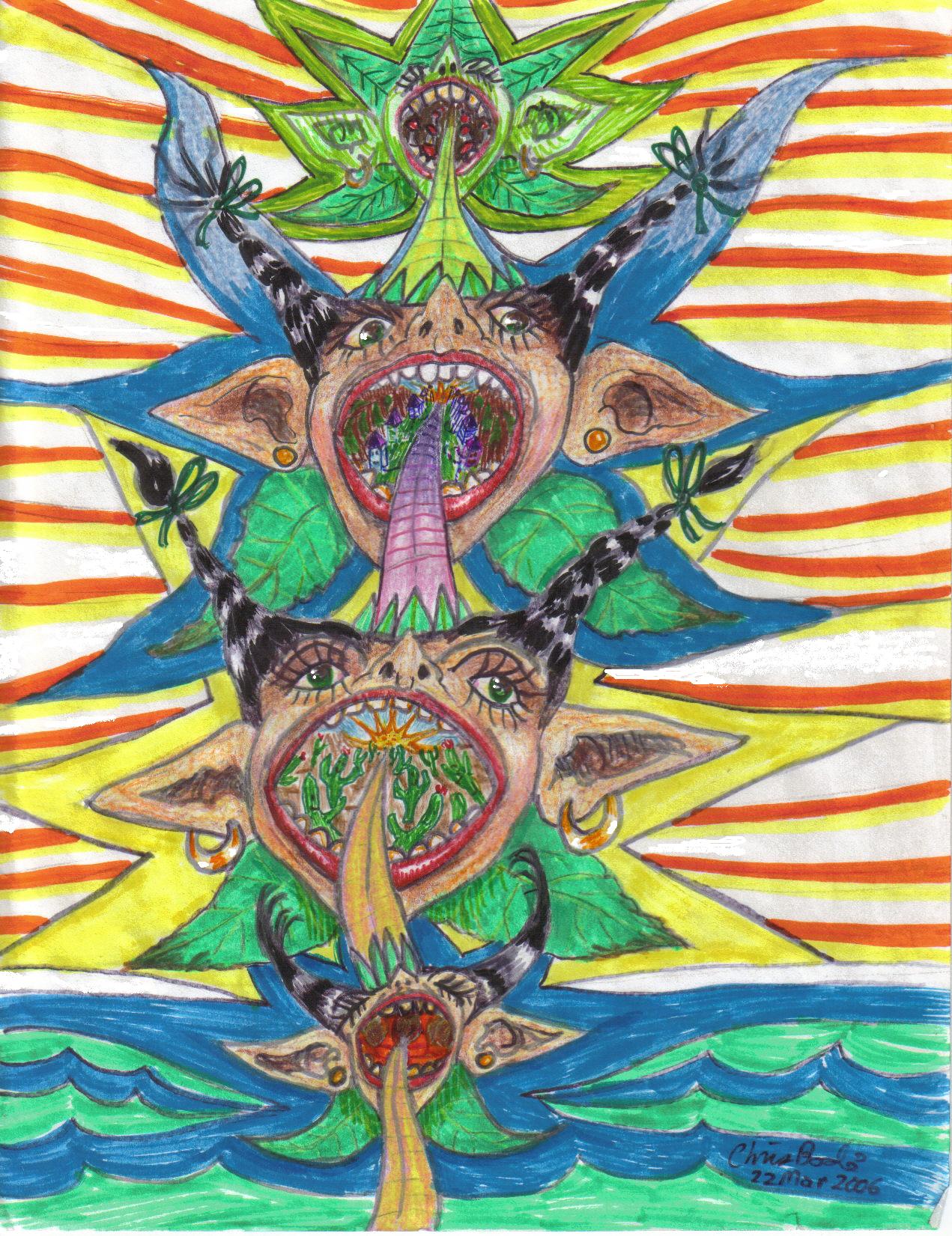 The next vision I saw was the sm-elf star open her mouth up. Inside her mouth was a smelf town. Her tongue, that was also her hat, became the road into the smelf town. The smelf face, who seemed to be the elf queen Sally Maria from other trips. She was the portal to this smelf town. It was one of those inside out fourth dimensional things that Sally likes to do. It is just a very weird thing, and it is very hard to explain. It was kind of like a loop of film that was separated by Sally's hat that became her tongue, and then that became the road that was going through the smelf town.