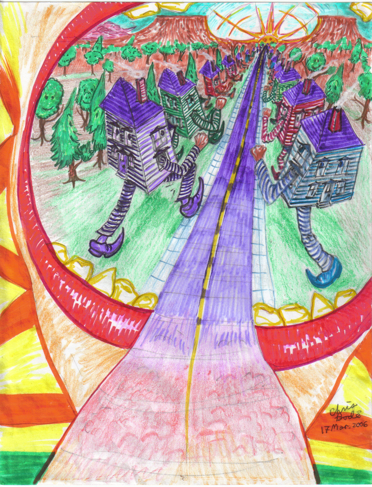 Whatever the case, inside her mouth I saw smelf houses, trees and leaves in there. Rainbow streaked smelf trees with leaves that had faces. One of the leaves fell down from a tree. As it did so, it winked at me. I went down the road there.