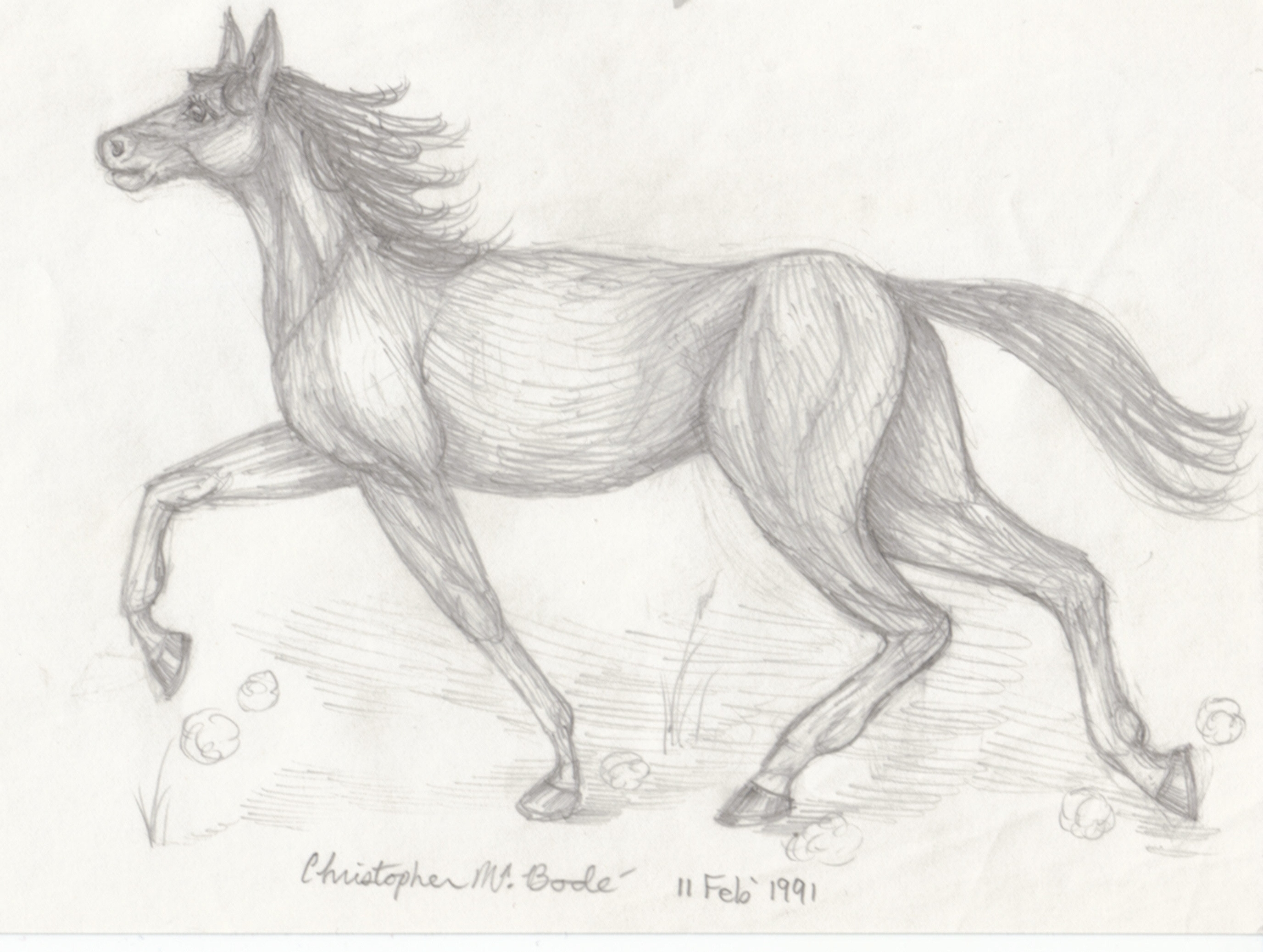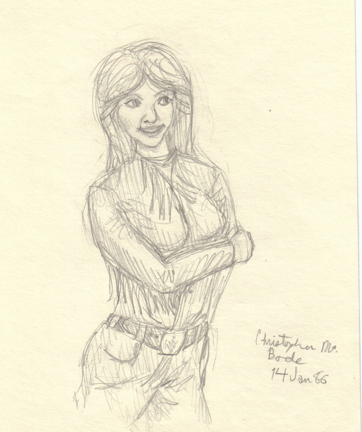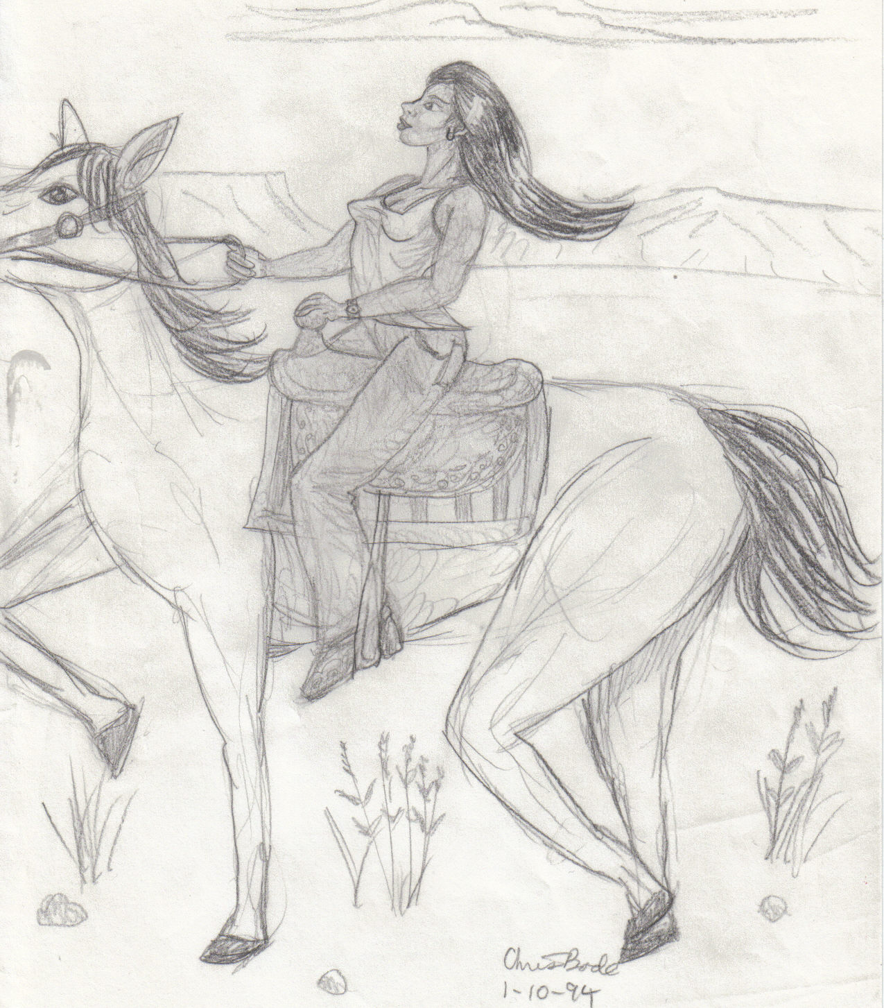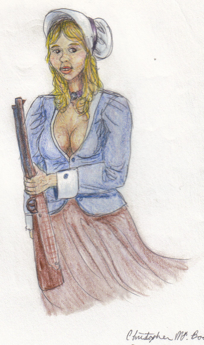 A color pencil drawing of a western pioneer woman with a riffle in her hand. |